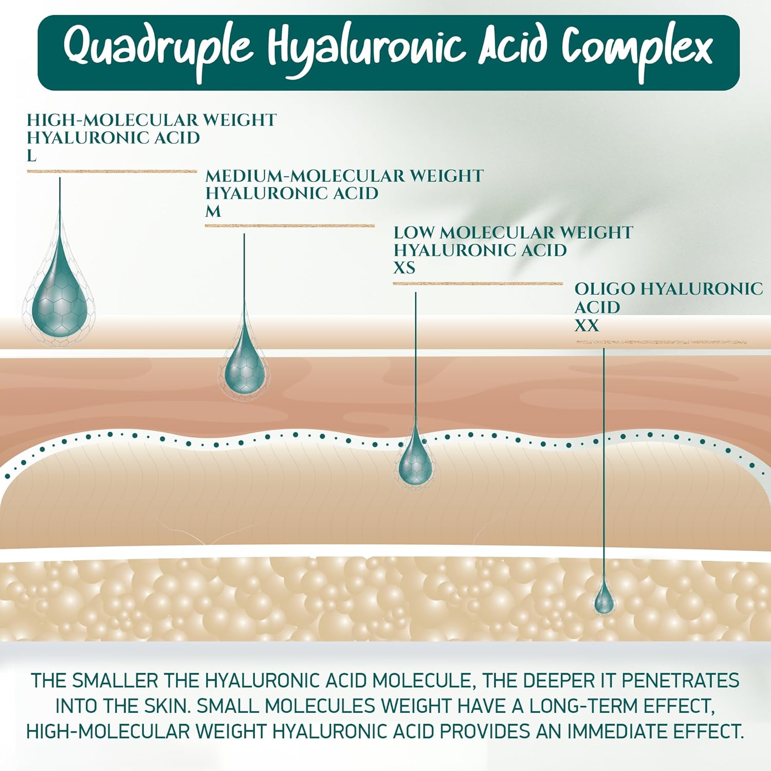 • 4 HYALURONIC ACID SIZES INSTEAD OF JUST ONE - Scientifically proven that the combination of several hyaluronic acid sizes achieves the best effect.